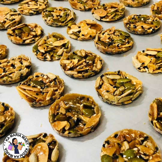 Biskut taburan kekacang dengan hirisan almond, bijian labu, bijian bunga matahari, bijian sesame dan disaluti
