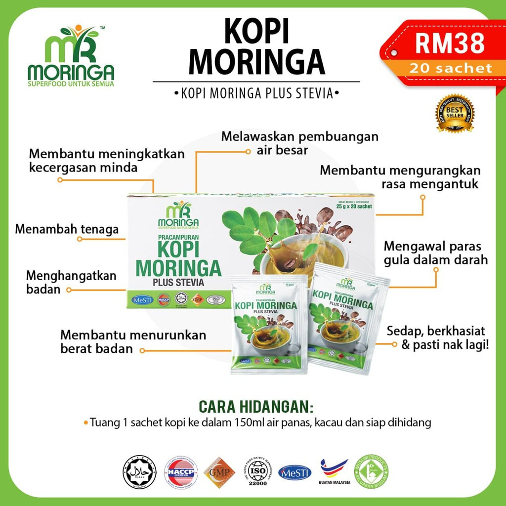 Kopi Moringa Plus Stevia Tanpa Gula Putih daripada MR Moringa. Sihat Tanpa Gula Putih Ramuan Khasiat Pemanis Stevia.