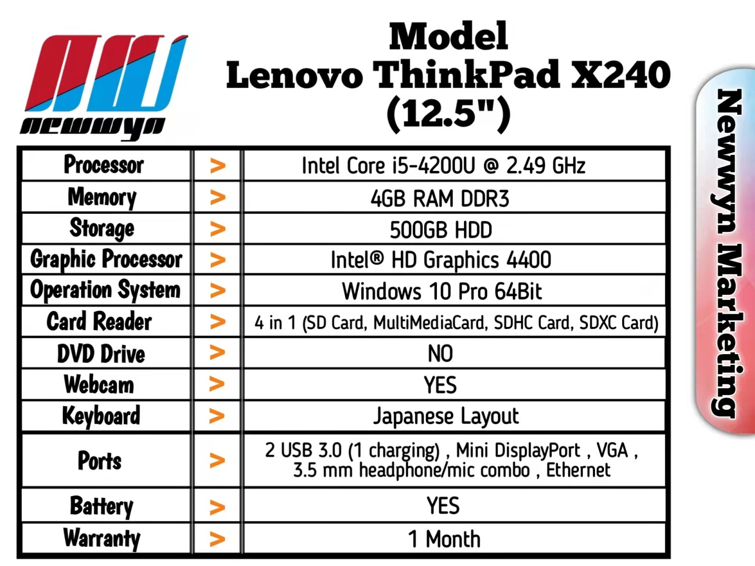 Model: Lenovo ThinkPad X240 Processor: Intel Core i5-4200U @ 1.6 GHz Memory: 4GB RAM DDR3 Storage: 500GB HDD / 128GB SSD / 256GB SSD / 480GB SSD Operating System: Windows 10 Pro 64Bit Graphics Processor: Intel® HD Graphics 4400 Screen Size: 12.5 Ports: - 2 USB 3.0 (1 charging) - Mini DisplayPort - VGA - 3.5 mm headphone/mic combo - 4-in-1 card reader - Ethernet DVD Drive: No Webcam: Yes Keyboard: Japanese Layout Battery: Yes Microsoft installed Office | Education | Business only Warranty: 3 Month