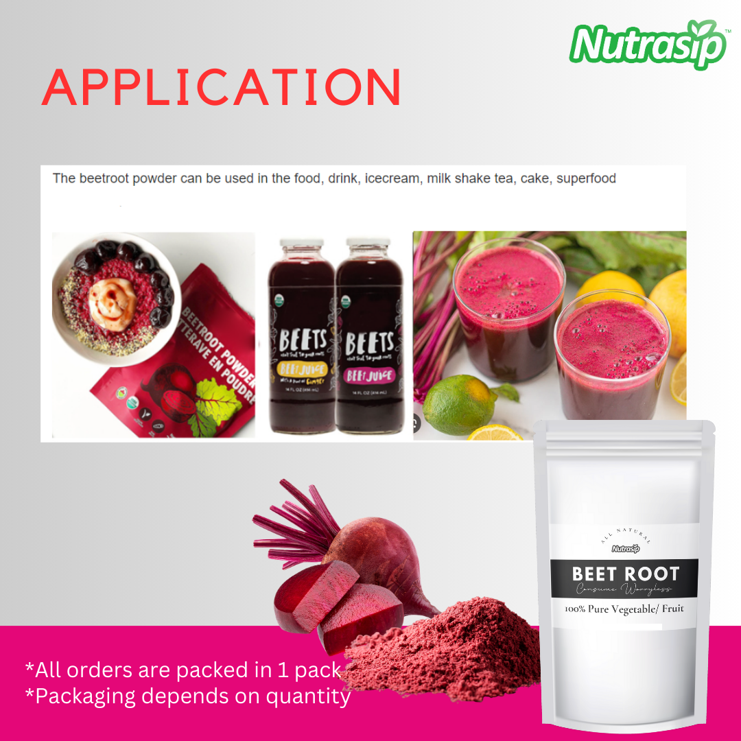 Serbuk jus bit bukan sahaja pigmen semulajadi untuk makanan dan minuman tetapi juga bahan yang bagus untuk makanan tambahan. Ia boleh membantu meningkatkan kesihatan dan kesejahteraan keseluruhan.