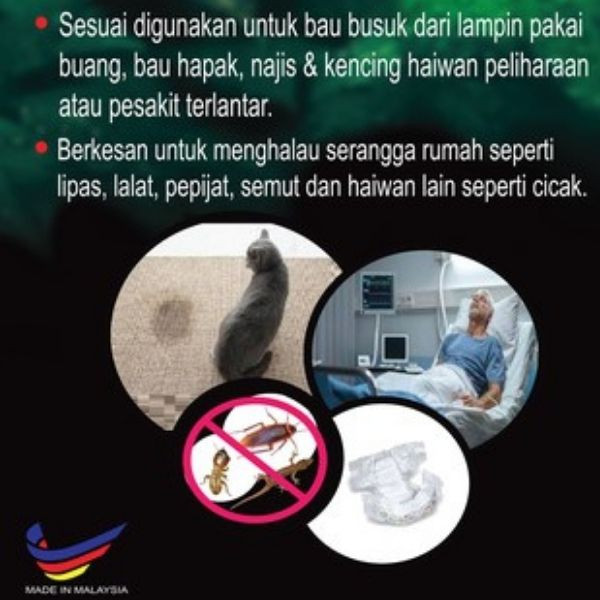 3. Boleh digunakan sebagai penghilang bau untuk menghilangkan bau busuk dari najis dan kencing haiwan peliharaan, bau rokok, persekitaran pesakit terlantar dll.