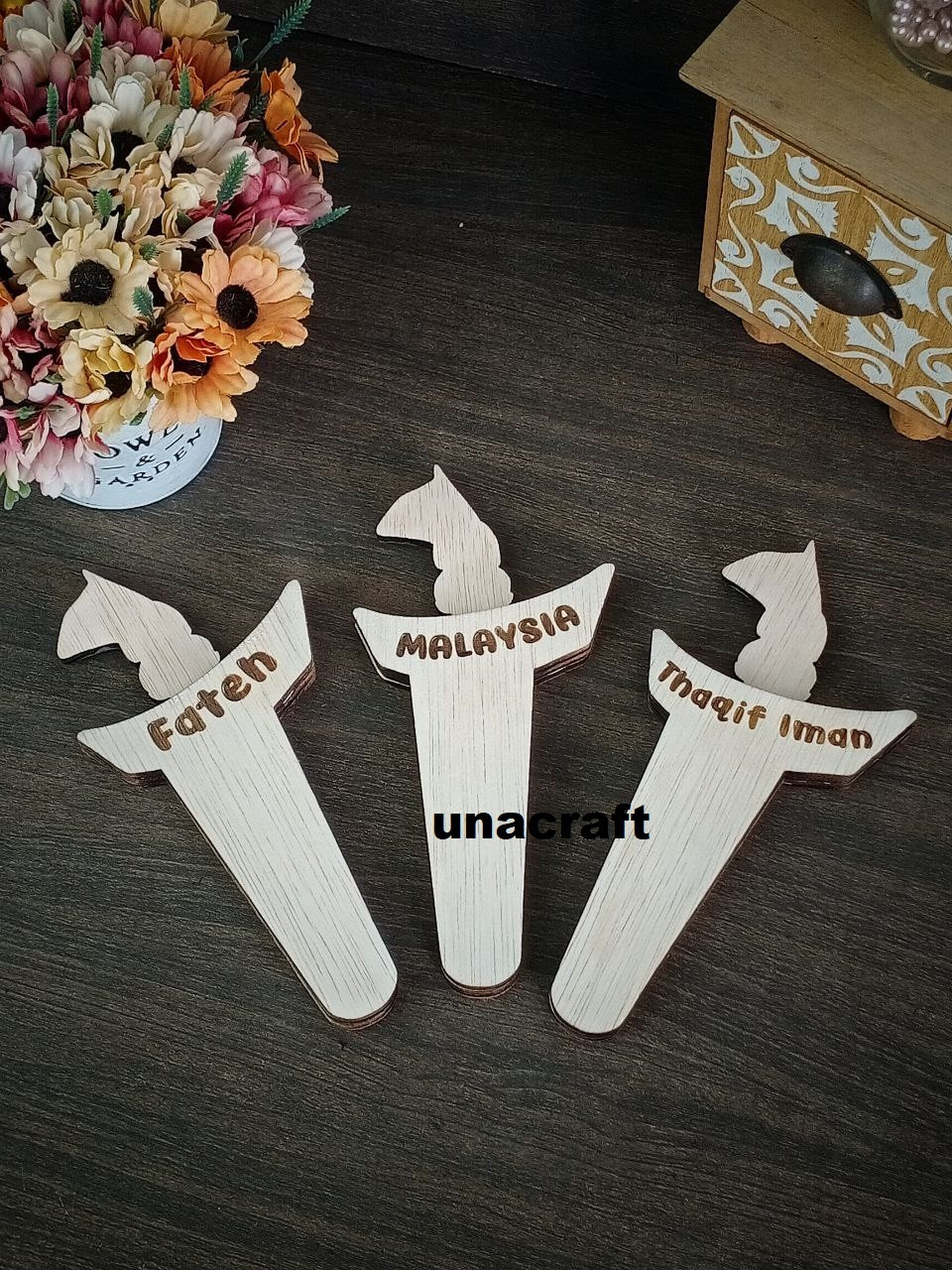Prop Kemerdekaan Keris bersama sarung dan custom nama di sarung (satu side sahaja)-Sesuai untuk kanak-kanak, bersaiz kecil-Hujung tidak tajam-Material Plywood kayu, warna kayu-Size keris 19.3cm x 7.4cm-Size sarung 20cm x 9.4cm