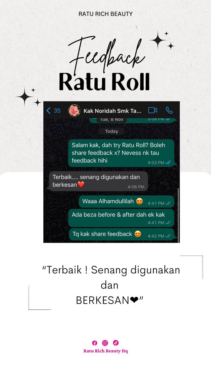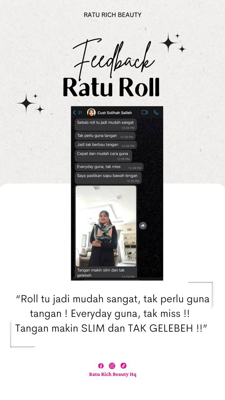 Ratu roll adalah slimming oil yang mempunyai water based yang boleh menyerap terus ke lapisan kulit tanpa rasa melekit dan gatal.