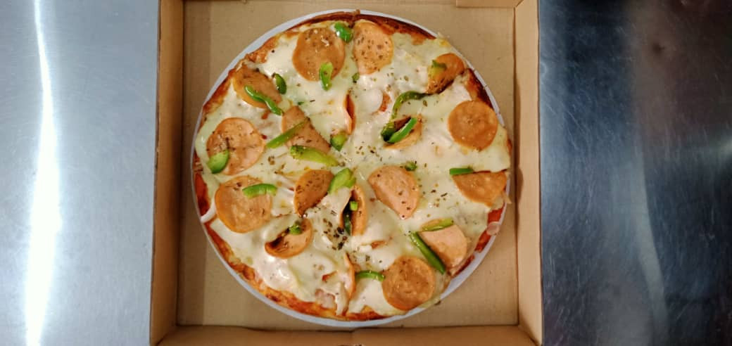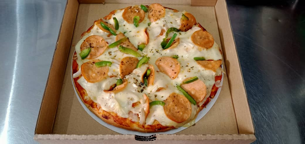 Tomato Concasse, Onion, Sauce Cheese, Mozzarella Cheese, Chicken Pepperoni, Capsicum, Oregano & Chili Flakes.
