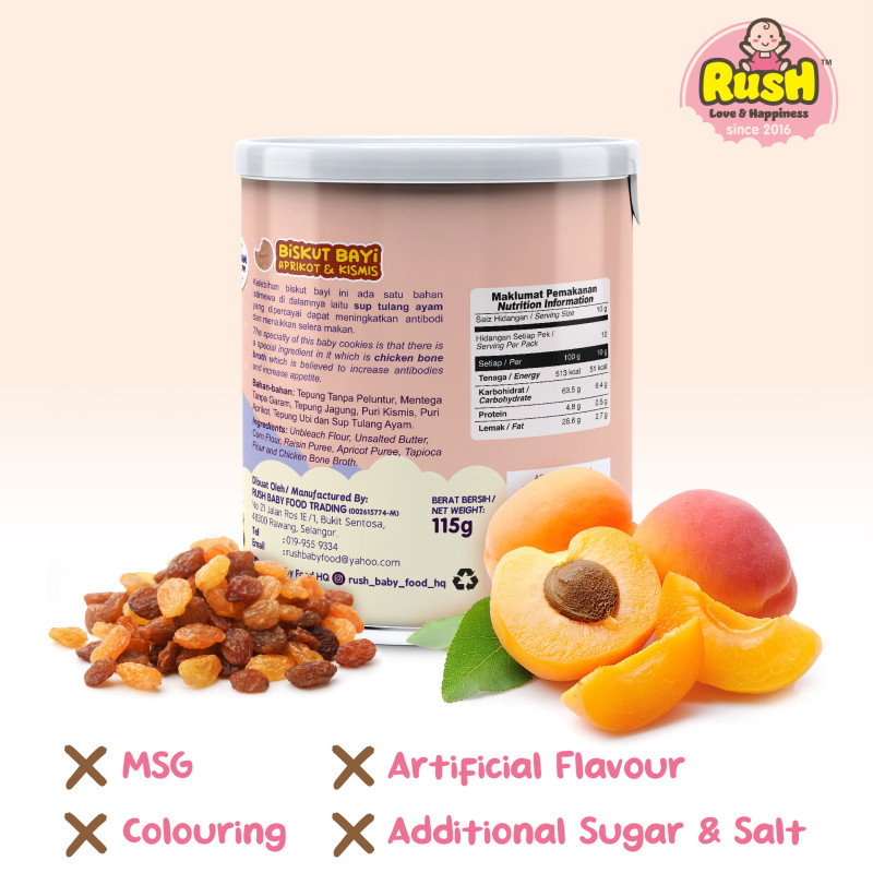 OF CHICKEN BONE BROTH * Help increase babies antibodies * Improve babies appetite * Strengthen growing bones & teeth * Supports immunity & digestion * Reduces the risk of allergies INGREDIENTS * Organic Chicken Bone Broth * Unsalted Butter * Unbleach Flour * Corn Flour * Tapioca Flour * Apricot Puree * Raisin Puree BONE BROTH COOKIES APRICOT RAISIN * Suitable for babies 7M+ * Made of Chicken Bone Broth * Ready to eat * No added sugar, salt, coloring & preservatives * Travel-friendly packaging Net Weight = 115g |