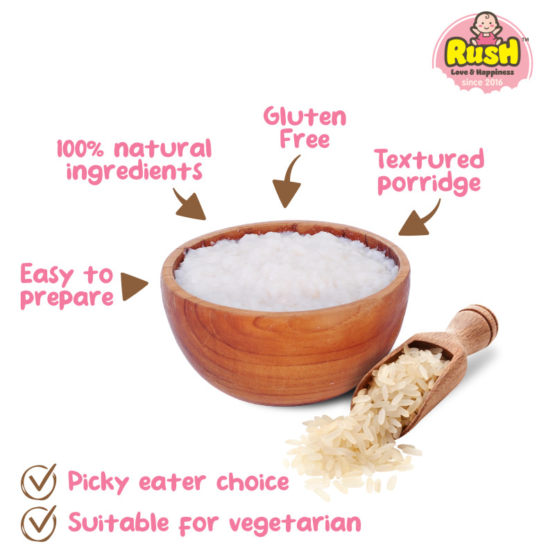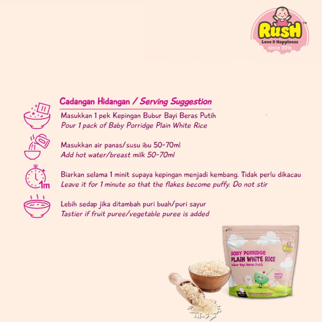 PORRIDGE PLAIN WHITE RICE * Suitable for babies 6M+ * Alternative to conventional porridge * Perfect for daily meal/travel * NO salt * NO colouring * NO Preservatives * Packed in reusable ziplock bag INDGREDIENT * 100% White Rice SERVING SUGGESTION * 6 months – Add 40ml of hot water (not warm) to 2 tablespoons of rice flakes. *7-11 months – Add 50ml of hot water (not warm) to 4 tablespoons of rice flakes. *1 year and above – Add 50ml of hot water (not warm) to 6 tablespoons of rice flakes. It is tastier if added with puree of fruit, vegetable and also chicken and fish. Can also replace hot water with hot soup. Net Weight = 150g |