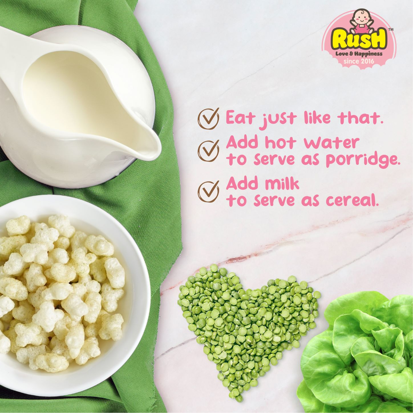 RICE PUFF GREEN PEAS * Suitable for babies 7M+ * Easy to handle * Convenient pack * Suitable for emergency snack * Suitable as a subtitute for rice * Ready to eat * Can be served as porridge/ cereal INGREDIENTS * White Rice * Brown Rice * Apple Juice Concentrate * Green Peas * Spinach Powder * Seaweed Calcium SERVING SUGGESTION * Eat just like that * Add hot water to serve as porridge * Add milk to serve as cereal Net Weight = 10g x 3 Pack |