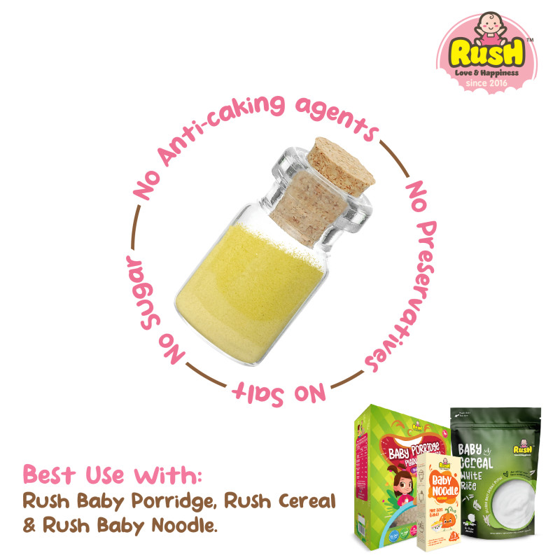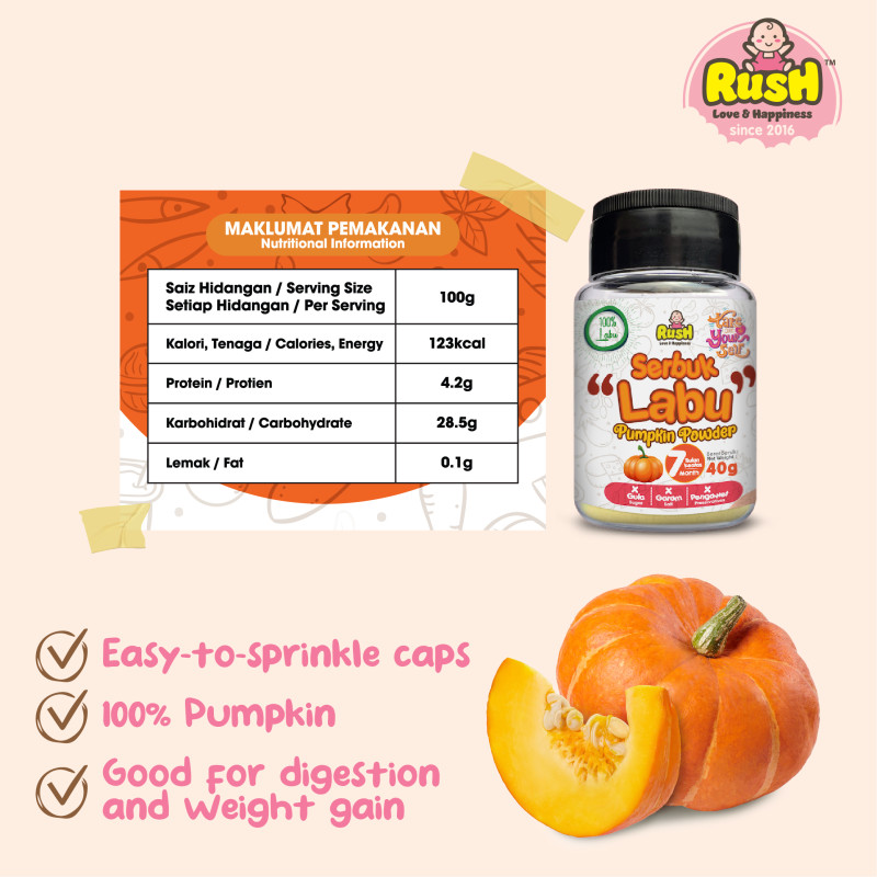 Seasoning Pumpkin Powder * Suitable for Babies 6M+ * NO Added Sugar * NO Added Salt * NO Artificial Colours * NO Artificial Flouvor * NO Preservatives * Eay To use Bottle * Suitable fo all dishes INDGREDIENT * 100% Pumpkin BEST USE WITH : * Rush Baby Porridge * Rush Baby Cereal * Rush Baby Noodle Pumpkin Net Weight = 40g |