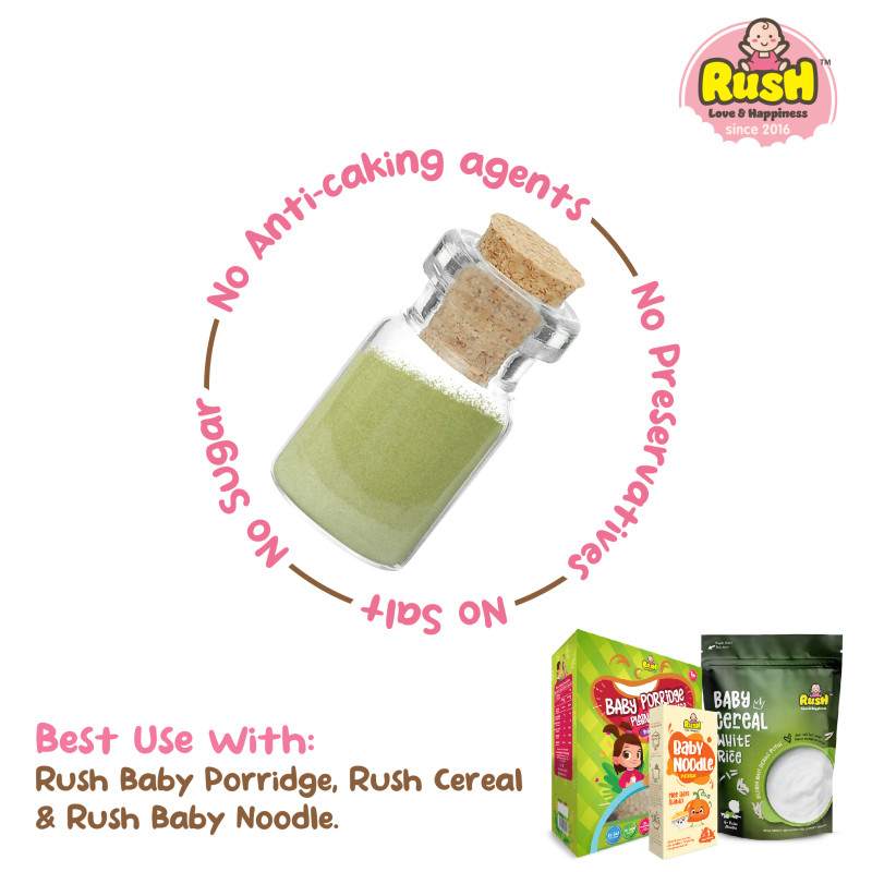 Seasoning Spinach Powder * Suitable for Babies 6M+ * NO Added Sugar * NO Added Salt * NO Artificial Colours * NO Artificial Flouvor * NO Preservatives * Eay To use Bottle * Suitable fo all dishes INDGREDIENT * 100% Spinach BEST USE WITH : * Rush Baby Porridge * Rush Baby Cereal * Rush Baby Noodle Pumpkin Net Weight = 30g |