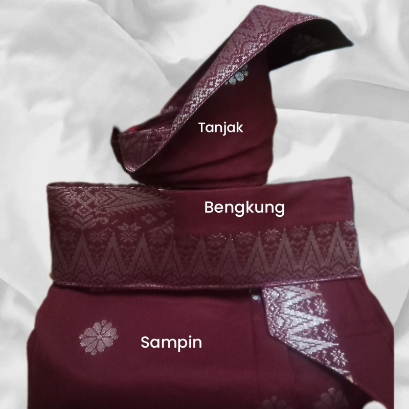 - Sampin: Aksesori pinggang lelaki, sampin ini juga terbuat dari kain songket bunga tabur dan dilengkapi dengan hiasan bunga serta sulaman emas di kedua ujungnya. Menambah kesempurnaan tampilan busana Anda.